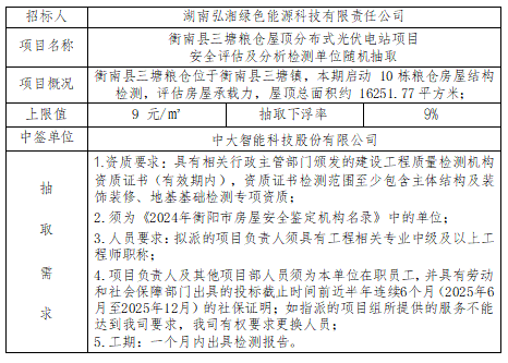 衡南縣三塘糧倉屋頂分布式光伏電站項目安全評估及分析檢測單位隨機抽取結(jié)果公示